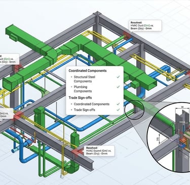 LOD 400 modeling in Tekla/Revit to identify interferences before they reach the field.